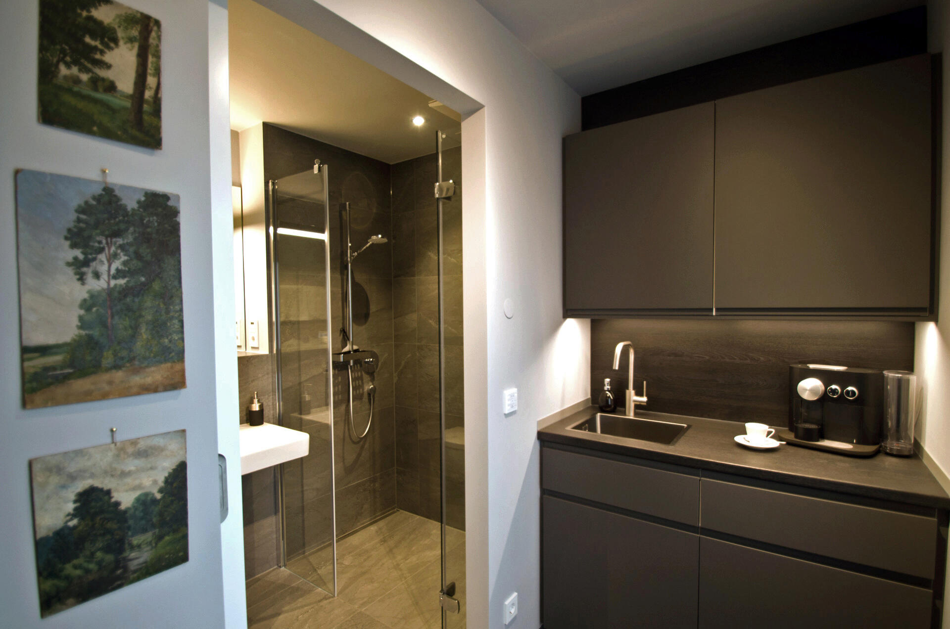 - Küchenzeile mit Nespresso-Maschine, Wasserkocher, Kühlschrank, Spüle, tragbare Einzel-Induktionskochplatte, Designer-Vintage-Geschirr